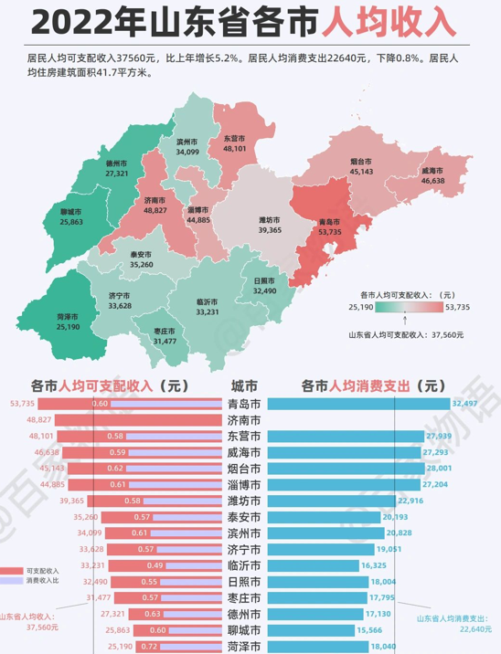 山东省全年居民人均可支配收入37560元,比上年增长5.2%。居民人均消费支出22640元,下降0.8%。居民人均住房建筑面积41.7平方米。 青岛市人均收入最高。济南、东营、威海、烟台、淄博和潍坊均高于省内平均水平。 鲁西和鲁南地区人均收入省内偏低。山东省整体收入是为数不多高于全国平均水平的省份,能提高过亿人口收入属实不易。