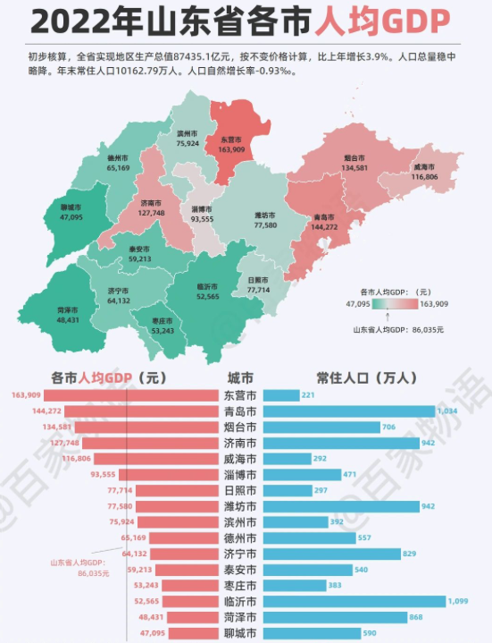 初步核算,全省实现地区生产总值87435.1亿元,按不变价格计算,比上年增长3.9%。人口总量稳中略降。年末常住人口10162.79万人。人口自然增长率﹣0.93‰。 东营市人均GDP最高,超过16万元。东营市3621亿GDP中,第二产业占了2092亿,而二产中的工业增加值达到了2018亿元。规模工业营收9600亿,石化占了6000多亿营收。 济南、东营、淄博、青岛、烟台和威海的人均GDP超过省平均水平。省会济南仅排第四。本周已陆续有地市公布今年的统计年检,人均GDP数据会有细微差距,但变化不会太大(±2%)。