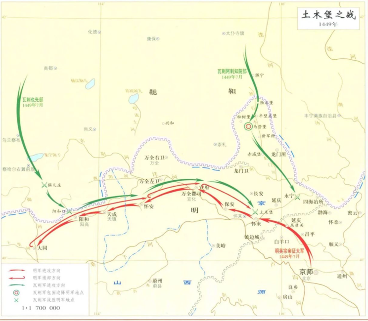然而,此时王骥率领的大明主力军团还没有回来,陈懋还在东南继续打义军,北方只剩下京城和宣大地区有足够多的兵力可以调配。明军出征后,朱祁镇放任王振对明军的行动路线上手微操,抵达大同后,王振得知前线战败,拖延了许久才建议朱祁镇返京,杨洪父子又隐瞒了独石马营等地失守的消息,致使主力军队走进了瓦剌人的伏击圈,明军损失殆尽,朱祁镇也被俘虏成为了“瓦剌留学生”