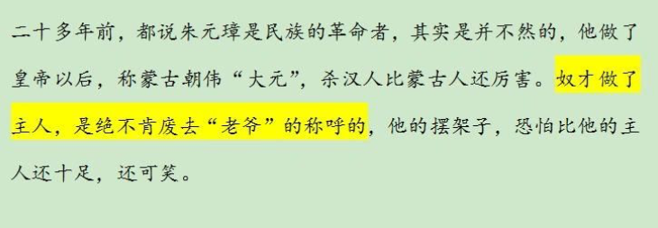 总体上看来还是很公允的,只是在这个明吹满天飞的时代,先生会不会也被那些黑色的朝圣者们誉为满清的余党呢?我横竖睡不着,思量了许久,翻开历史课本,只看到两个字,“奴才”,我幡然醒悟,原来是那些可悲的朝圣者们,适应不了没有奴才的新中国,在为他们那已经消失了几百年的主人发声,它们将这种行为称之为“反清复明”