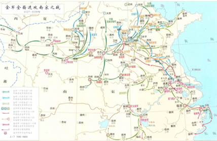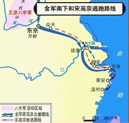 公元1125年,宋金联合攻灭辽国,金军又大举南下攻宋,兵锋直指开封。宋徽宗畏敌如虎,急忙把皇位让给太子赵桓(宋钦宗)后独自南逃。金军久攻不克,提出了割地赔款,以人为质的撤军条件,于是康王赵构“主动请缨”和少宰张邦昌一同作为人质送往金国。然而,金国对赵构的身份份量有所怀疑,提出以肃王赵枢换康王赵构,赵构因此逃过一劫,因出使之功升为太傅。公元1126年,因北宋迟迟未允诺割地之事,金兵再度南侵,赵构又一次被委派出使金国,半路却退回相州。面对金兵的步步紧逼,宋钦宗拜赵构为河北兵马大元帅,要他率勤王之师前往救援,结果金兵很快就攻破开封,生擒二帝。赵构没有理会父兄被俘、百姓惨遭蹂躏的局面,而是反方向移师至大名府。他也是宋徽宗的儿子,是正统皇室子弟,只要他振臂一呼,同样可以挽救这个破碎的王朝。公元1127年,为避免与强势的金兵遭遇,赵构先退入山东境内,后继续向南抵达南京应天府,一路跑一路收集部队。此时的金军已经满载而归撤退,赵构终于可以祭天称帝,开辟属于自己的王朝。公元1128年,金国不答应赵构的求和条件再度南侵,金军一路势如破竹直奔扬州,赵构闻听消息脱了黄袍穿上甲胄骑马逃出了扬州城,先后逃到越州、明州、定海,直至跑到了海上,金军孤军深入又不擅水战,只好撤军。外患暂时平息,赵构却不愿再返回建康,打算长驻越州。公元1131年,赵构升越州为绍兴府,改年号为“绍兴”,并重新组织朝廷班底,一方面任用岳飞等主战派抗金,一方面又提拔秦桧负责贯彻和执行对金妥协政策。公元1141年,主战派张宪、岳云被斩首,南宋终于与金国签订了《绍兴和议》,其中包含南宋称臣纳贡和宋金以秦岭、淮河为界的条款,换来了二十年的苟安。公元1161年,金朝完颜亮政变夺权后,一心想要统一天下,随即发动了对南宋的进攻,却在采石之战中大败,自己也为部将所杀。公元1162年,赵构提出禅位于宋太祖的裔孙皇太子赵眘(宋孝宗),自称太上皇帝,移居临安府德寿宫颐养天年,背后仍然敦促宋孝宗赵昚同金议和,促成隆兴和议的达成。公元1187年,养老二十余年的赵构驾崩,作为南宋的建立者,庙号高宗,谥号圣神武文宪孝皇帝,葬于浙江省绍兴市永思陵。