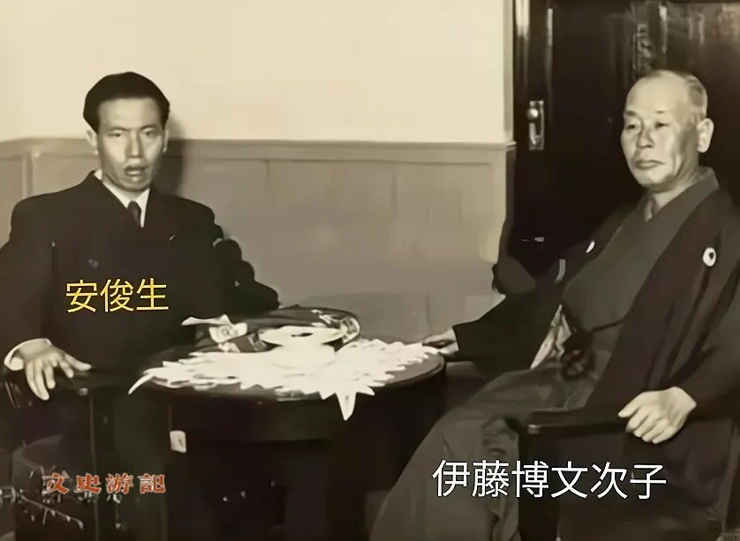 1939年,安重根的儿子安俊生和伊藤博文的儿子会面时的合影,在此之前,安俊生还代表自己父亲在伊藤博文的灵位前道歉,宣扬所谓的“日韩亲善”,引起了广泛的争议和批评。