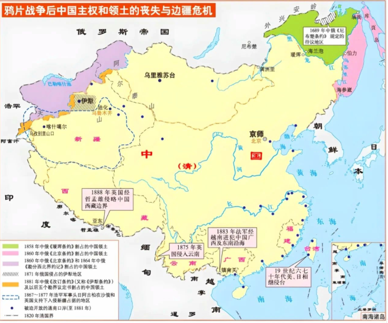 清朝前期在领土开拓方面取得了较好的成效,但就如同大多数封建王朝一样,进入中后期之后就面临空前的边疆危机,与以往的王朝不同,清朝面对的是前所未有的外来威胁,因而丢失的地区也和其他时期不太一样,很难再收复回来,而清代中后期统治者的边疆意识较为薄弱,尤其在在东北和西北方向尤为严重,很多都是在没有遭遇军事失败的情况下,就很轻易的送出了大片在当时他们眼中“没有价值”的土地,殊为可惜。