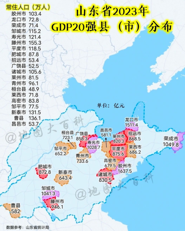 山东省2023年GDP前20强县出炉!截止2023年山东省有26个县级市52个县,GDP排名前20的县一半分布在胶东地区,鲁西和鲁南地区县域经济还得加油啊!前20强县名单基本和去年保持一样,名次方面肥城超招远,广饶超诸城,曹县超昌邑,其他名次不变,千亿县没有增加,滕州去年增速缓慢未能破千亿,滕州今年加油吧!