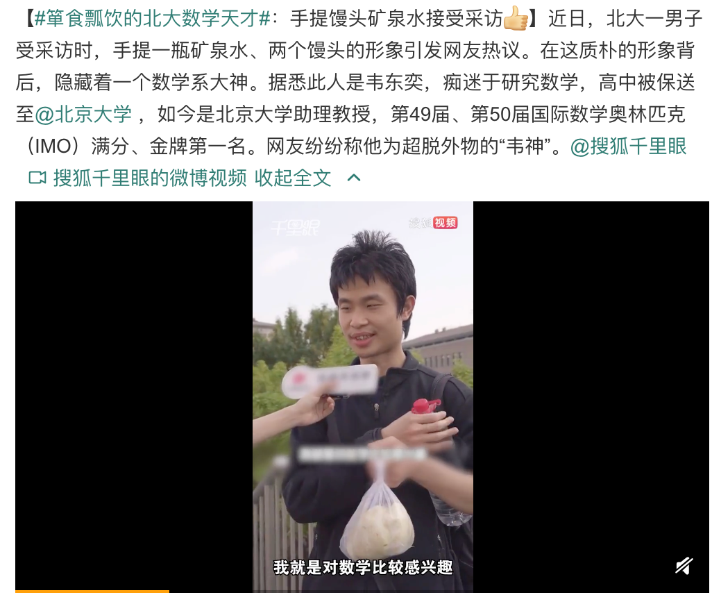 最近一段时间,由于高考临近,很多人在网上为高考学子们加油打气儿,一条来自北大数学老师的视频爆火网络,在视频当中的这位其貌不扬的男生,自称来自山东是北大的老师,他是北京大学数学系的10级本科生,14级研究生,高中数学联赛的山东省冠军被保送北大,这位拿着矿泉水瓶和两个包子的说话还有点儿结结巴巴的男生,没想到却是人们意外发现的北大超级扫地僧。