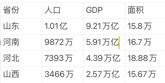 一直以来有一个概念就是中东部地区县级人口是50万左右,地级市500-1000万左右,而省则就是一亿左右。但是最近跟山西的同事聊天忽然知道山西人口才有三千多万,忽然意识到人口稠密的山河四省可能在体量上并不是同一个级别,查了一下四省2023年的数据确认在经济和人口规模上,确实不是一个体量级的