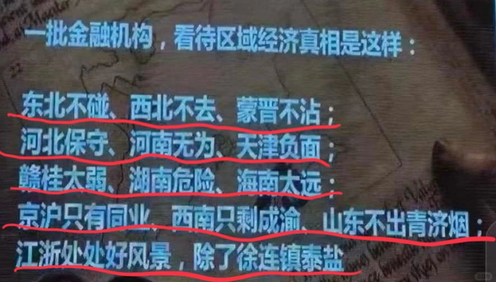 投资不过山海关,西北蒙晋非矿/能源其他不沾。河北河南需打点,打点不够本金完。天津步大拉了胯,进去当心是接盘。赣桂老区人刚猛,湖南海南没政策,不优先。京沪同行死里卷,西南成渝之外不同天。徐连镇泰盐潍淄,欢迎当做永续债来投资