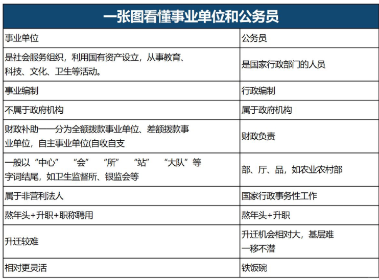 1工作内容公务员是国家政府工作部门的工作人员,具备行政执法权。事业单位是服务性质的单位,通常情况下不具备行政执法权,这是事业单位与公务员之间最大的差别所在。因此,公务员工作比事业单位工作压力稍大。2晋升途径公务员编制晋升走级别,晋升途径一般是从科级、处级、局级到部级。公务员参照公务员法进行考核选拔,不签劳动合同。而事业编制走的是职称,晋升途径一般是由初级工、中级工到高级工,岗位一般分为管理岗和技术岗,需与用人单位签订劳动合同。3薪酬待遇公务员的工资收入是按照《国家公务员管理条例》的规定发放,并根据国家财政状况进行调资,公务员享受的保险福利是按照《国家公务员管理条例》的规定执行。事业单位人员的工资收入一般不受国家约定,由各事业单位根据市场情况而定,事业单位人员享受的保险福利是按照国家有关的社会保障规定执行。4编制、工资来源公务员编制就是单位工作的正式人员,其工资由财政全供。事业单位工资由财政全供或者财政部分供给或者自收自支。事业单位的工资形式有三种:一种是全额参照公务员待遇,全额财政拨款,像林业局。一种是差额的,给一个百分点,然后自己单位给你发一个百分点,像公立医院。还有一种就是只管编制,不管工资,只给政策。总体而言,事业单位的工资结构和公务员不一样。在编制这方面,公务员考试录用后有公务员编制;事业单位考试录用后是事业单位编制,须参加公务员考试并被录用后,方可转为公务员编制。5招考区别所有的公务员都是通过公务员考试进入(包括事业单位中的公务员),事业单位招考是不会招考公务员的,事业单位招考,主要是针对科、教、文、卫、交通等系统,报考时还有一些具体限制。如报考教师的,需要教师资格证,报考医院的,需要医师资格证书等。6笔试组织实施机构公务员考试的笔试组织实施机构是人事部公务员管理司、各省、市人事厅局所属人事考试中心(事业单位,考试中心命题和组织报名、考试属于公共服务机构);事业单位考试的笔试组织实施机构多数委托省、级和地级市的人事厅局所属人事考试中心(事业单位,考试中心命题和组织报名、考试并交用人单位成绩名单,部分单位自行命题组织实施。7考试难度从目前的考试情况来看,公务员考试较难(试题难不意味着难以考取,难度仅是因为报考人数多而必须增加考试的区分度);事业单位考试较容易(试题简单不意味着容易考取,因针对具体每次考试的报考人数相对较少)。