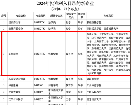 北京时间3月19日消息,教育部近日宣布了2023年度普通高等学校本科专业的备案和审批决定,并发布了2024年的本科专业目录。在这一系列调整中,备受瞩目的足球运动专业也被正式纳入目录,其专业代码为040214TK,归类于体育学类,学制为四年,毕业生将获得教育学学位。 对此,有媒体人潘伟力欣喜地表示,多年来的呼吁终于有了回应,高校开始设立本科足球专业。