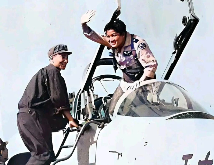 1981年8月,福州,台湾空军少校黄植诚挥手致意时的照片,他当时驾驶这新型的F5战斗机,从台湾起飞降落到了福州,正式进行投诚,受到了热烈的欢迎。