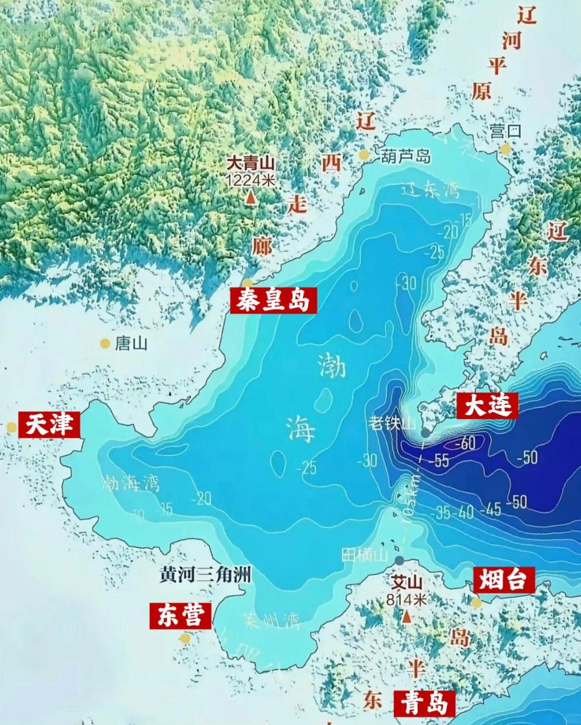 从图中可以看出,大连附近渤海海峡的水深条件很夸张,最深处水深超过60米,且海岸线漫长,因此国际邮轮畅通无阻,加上没有河流注入带来的大量泥沙,无需任何清淤工作,航道条件绝对顶级。因此,大连港才是北方第一良港。