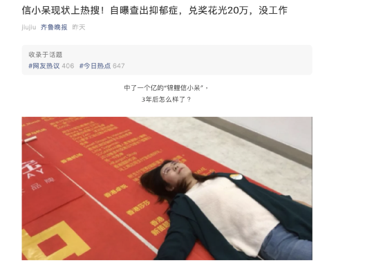最近社交网站上曝出了,曾经因为支付宝大奖花落,他家被称为中国锦鲤的信小呆,他被爆料自己快30岁没钱没工作,刷爆信用卡还被查出了抑郁倾向,短短的几个字概括了自己,在成为锦鲤女孩儿那容光一刻之后,瞬间坠入凡尘,如今一地鸡毛的自己生活现状,三年之前的那个夏天的2018年支付宝推出奖品金额高达1亿,寻找中国锦鲤的抽奖活动。那个时候的抽奖概率低到大概能考上1000次清华才能够中奖的概率,但使信小呆却意外的成为了那个几百年难遇的幸运儿。从这件事情之后,自己也从一个普通的国企职员变成了人人羡慕的锦鲤女孩,微博粉丝瞬间涨到百万,自己辞职办护照环游世界,但是亿元大奖并不是想象中的给现金,而是支付宝提供给他的价值1亿的优惠券。虽然有许多的过程是免费的,但是大部分的还是需要新小贷自己承担的费用,