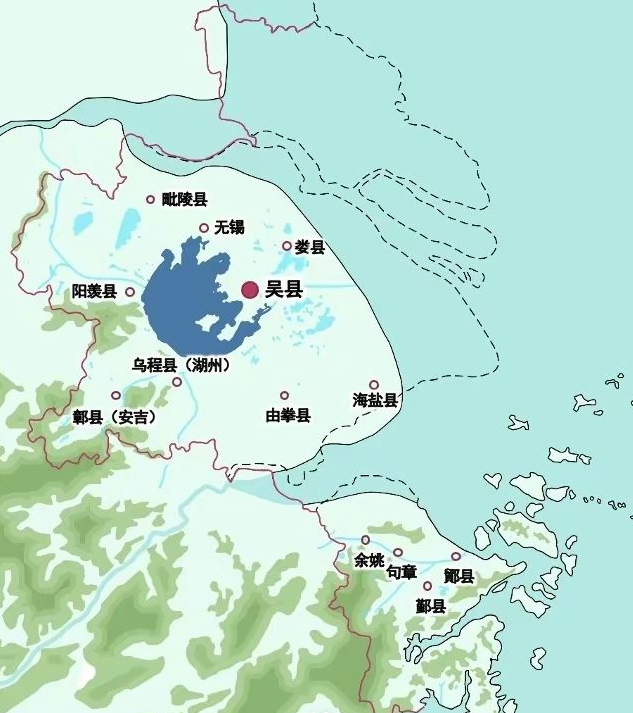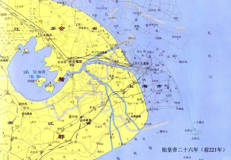 上面是复旦大学历史地理研究中心编制、发行、出版的“上海历史地理图”中的一幅,是关于古代上海市的历史地理图。其实秦朝以前,这一区域仍是一片水乡泽国,约30%土地尚未完全成型。即便到了两汉时期,也仍然是一片荆蛮之地,只是围绕着太湖周边有了人口集聚,彼时人口总量仅有60万,人口密度14人/平方公里,仅为当时中原地区的1/10。那个时候太湖流域的大陆海岸线,还处在今天的嘉定、闵行、奉贤等这一线,它们的东面全是海洋。即今天的上海市中心城区,此时此刻其实它还都在太平洋东海海洋底下的大陆架上呢。也就是说上海的陆地,当年还根本就不存在。