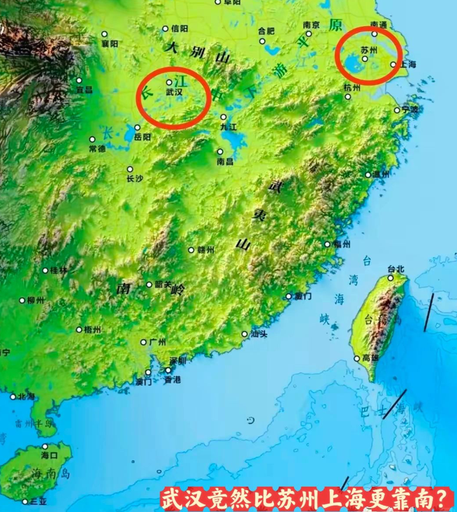 之前一直以为,武汉挺靠北的了。仔细看地图你就会发现,其实,武汉比苏州和上海还要更靠南方一点,纬度更低。更别说合肥和南京了。这两个城市其实在武汉的东北边,而不是单纯的东边。