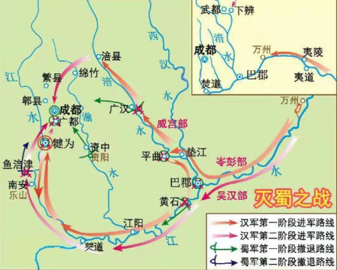 35年,岑彭军攻克荆门,斩杀任满,田戎退守江州,岑彭长驱入蜀,沿途郡县降附,直迫江州。江州城固粮多,岑彭留兵围困,自率主力直指垫江,攻破平曲。公孙述令延岑、吕鲔自汉中率军驰援犍为郡,岑彭设疑兵,留臧宫于平曲拒延岑,自率军攻占武阳,进击广都。公孙述派人刺杀岑彭。来歙军大败王元、环安军,攻破下辨、河池,挺进蜀中,环安派人刺杀来歙36年,冯骏攻占江州,俘获田戎。吴汉率部于鱼涪津大破蜀将魏克、公孙永,进围武阳,史兴、公孙恢战死,攻破广都,逼近成都。之后吴汉再败蜀军,斩杀谢丰、袁吉。臧宫攻克繁县、郫县,与吴汉会师,合围成都。吴汉示弱诱公孙述出击,蜀军大败,公孙述重伤死,延岑向吴汉投降,吴汉纵兵大掠,尽诛公孙氏,“成家”亡