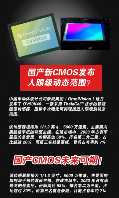 中国半导体设计公司豪威集团(OmniVision)近日发布了 OV50K40,一款采用 TheiaCel™ 技术的智能图像传感器,据称单次曝光可实现接近人眼级别动态范围。