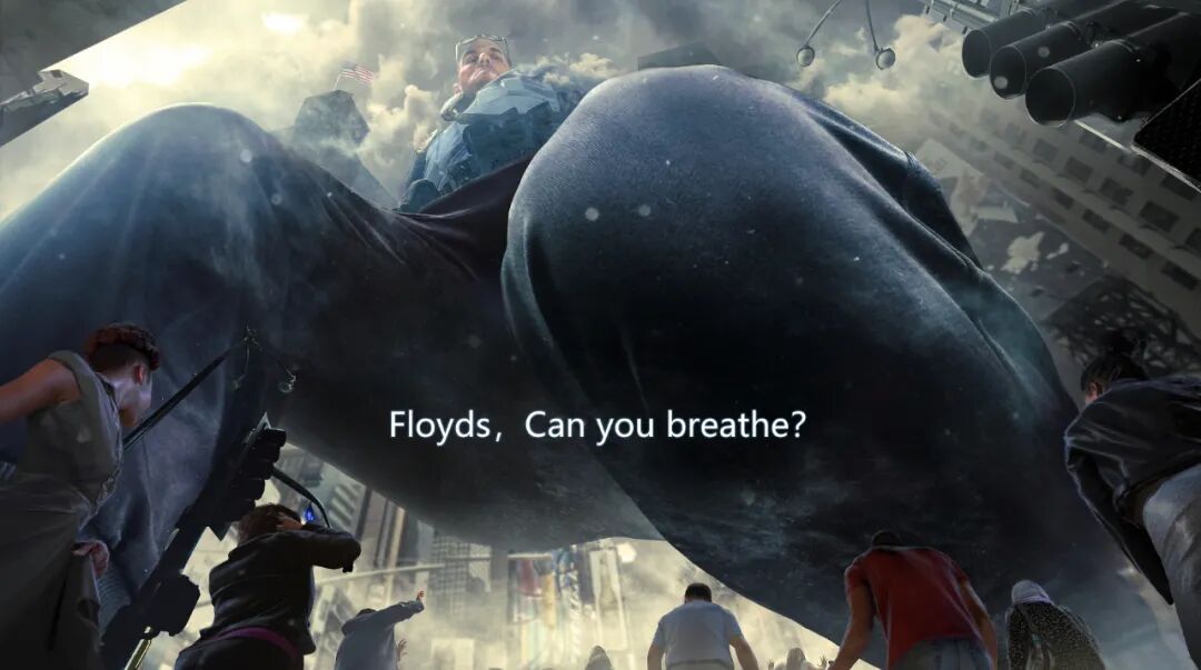 这张图的文字翻译是,弗洛伊德,你能呼吸吗?明显暗示的是美国发生压迫黑人弗洛伊德之后,造成的美国种族撕裂和有色人群被美国本土民族所歧视的一种社会高压态势。
