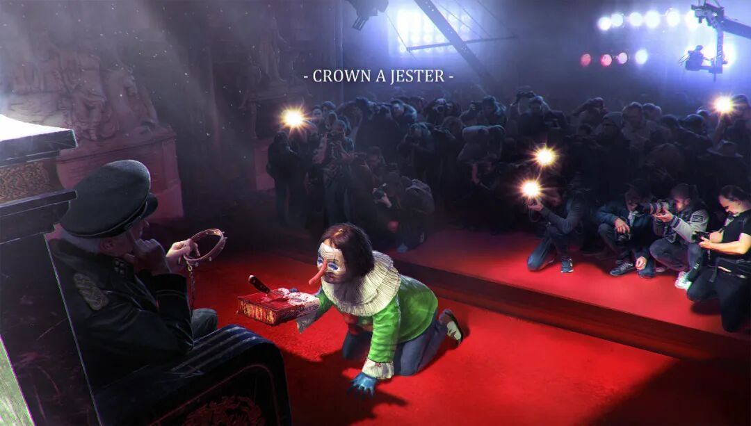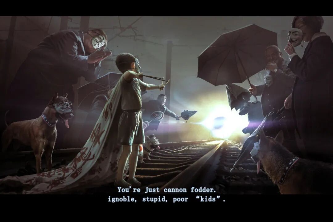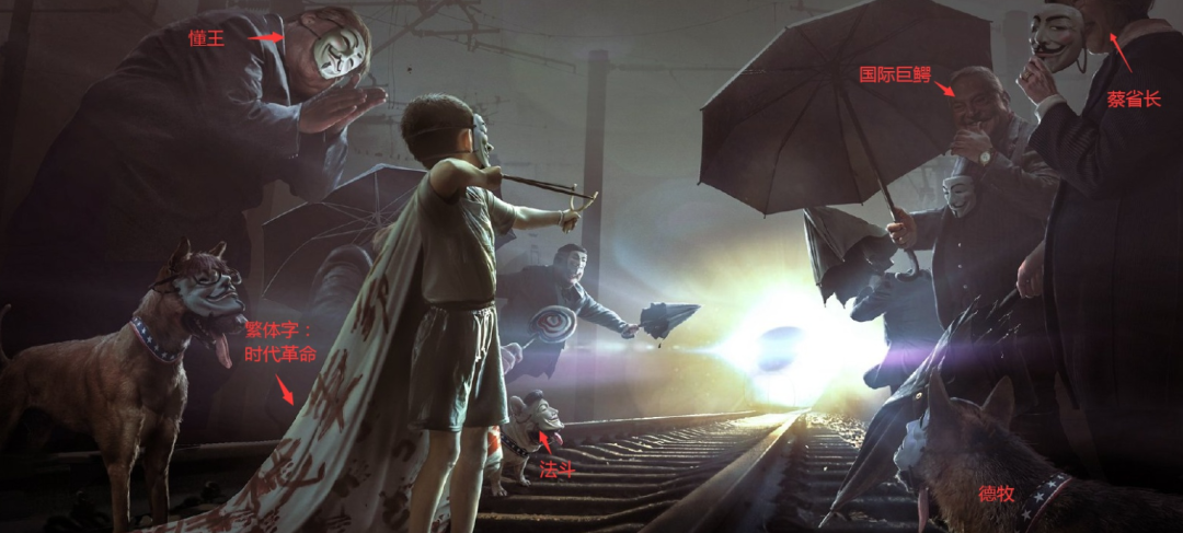 铁路旁的人物分别是懂王国际巨鳄和台湾的蔡省长,而他们的旁边分别站着三条狗,分别是法斗和德牧,中间小孩身上披着的白色被单,上面用繁体字写着时代革命,所有人和狗头之上都配着象征无政府主义的V字仇杀面具,有的人已经拿下面具,露出了虚伪的笑容,狗所佩戴的项圈更代表独立的军犬,而不是宠物。