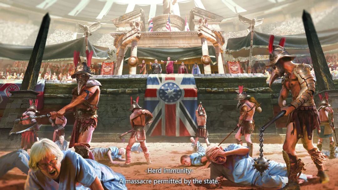 面对着欧洲国家当中,以英国为首的一些对于疫情知识无知的国家,采取了群体免疫措施,将全体国民的生命安全置若罔闻,而只顾经济发展的一种做法,乌合麒麟用这样一幅画来表达着对他们无知的行为的嘲讽。