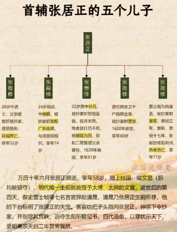 明朝首辅张居正的五个儿子——长子自杀,其他四子长寿