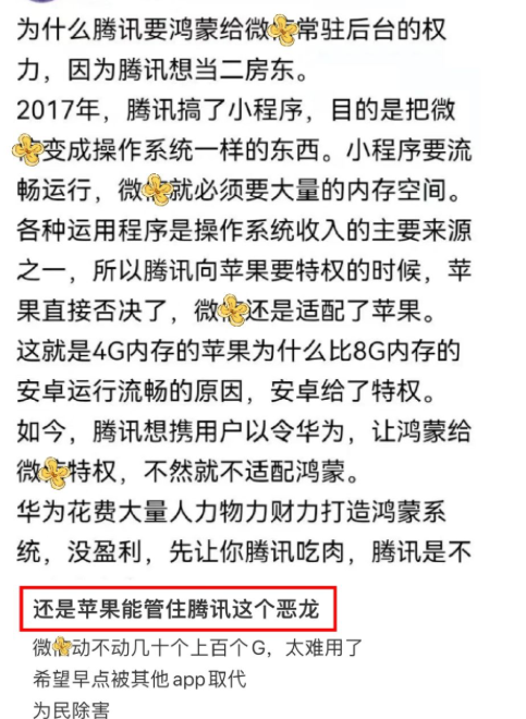 💬:还是苹果能管住腾讯这条恶龙?·啊?背后还有这样的故事吗😳说起来是感觉同内存的苹果比安卓长时间用下来会流畅一些,我还以为是系统的问题呢……