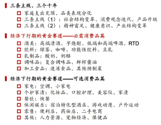 在日本经济下行期,尽管整体消费市场表现疲软,但仍有一些细分品类因消费场景的延伸和特定客群的兴起而表现出色。🌟 家庭支出见顶后,必需消费品消费额仍有小幅上升,而可选消费表现较为疲弱。食品细分品类的人均消费额普遍上升,尤其是乳制品/预制菜/饮料等。🌟 三条主线影响了消费品类的表现:社会结构变革(如女性参工率上升、家庭规模缩小、人口老龄化)、消费人群迭代(如“团块次代”成为消费主力)、产品创新(如提升产品附加值以应对成本上升)。🌟 今天,我要和大家分享一篇超有料的干货——在日本经济下行期,那些逆流而上的赚钱道!🏎️💨🍶【酒类】——高端清酒、芋烧酎、精酿啤酒,这些酒类在追求品质生活的人群中大受欢迎。无论是独自小酌,还是与朋友分享,它们都是情感交流的媒介。☕【饮料】——绿茶、咖啡、功能性饮料,这些健康又提神的饮品,满足了现代人快节奏生活中的小确幸。忙碌之余,一杯好喝的饮料,就是最好的慰藉。🥛【乳制品】——酸奶和奶酪,不仅美味,还富含营养。在这个注重健康的时代,它们成为了家庭餐桌上的常客。