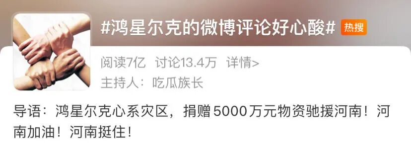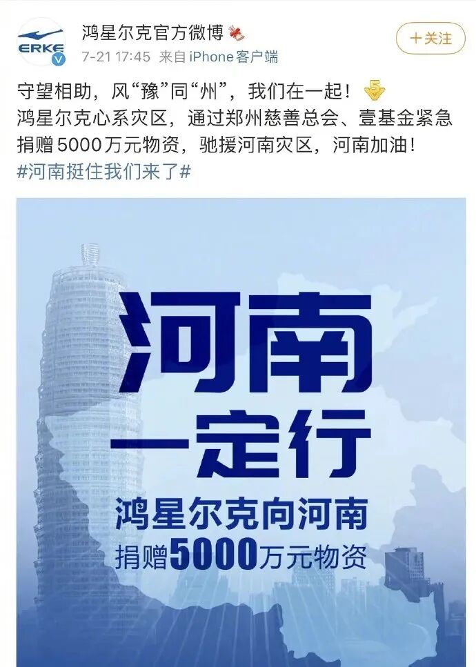 最近河南郑州因为大雨天气而导致严重的洪涝灾害,许多中国企业纷纷捐款捐物在捐款名单里面,鸿星尔克的名字,引起了大家的广泛关注,这个中国国产品牌当中,目前濒临经营困境的牌子,默默的捐出了5,000万,但是。作为中国运动品牌。当中的差生,鸿星尔克的营收10分的困难,更是在去年赔了6,000万,但是毅然决然的拿出了5,000万捐款。鸿星尔克的老板买不起热搜打不起广告,连微博会员都没有,但是在捐款之后直接被网友们安排上了2140年的会员。