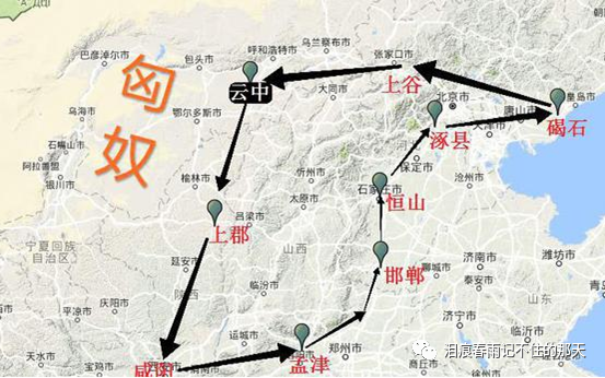 之后,基本是沿着燕长城和赵长城的轨迹来到云中(今黄河东河附近内蒙托克托一带),再南下上郡回咸阳。