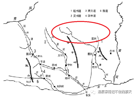 结合上节的地图,西北蛮族要想南下侵袭关中,可行的道路是萧关道和马莲道(灵州道),也就是图中的3和2。
