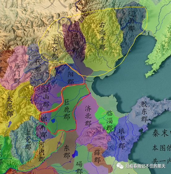 张耳现在控制着巨鹿、常山(也叫恒山)、广阳和邯郸北部邯郸城。大体是图中红色和橙色线条包住的部分。