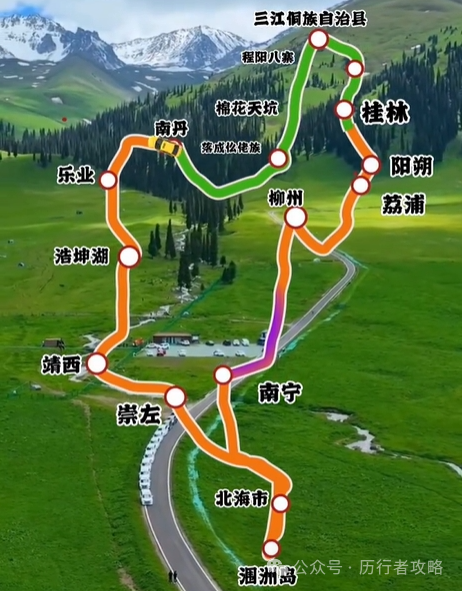 从北海涠洲岛出发,经过南宁、柳州、荔浦、阳朔、桂林、三江侗族自治县、程阳八寨、棉花天坑、南丹、乐业、崇左等地,最终回到北海涠洲岛。