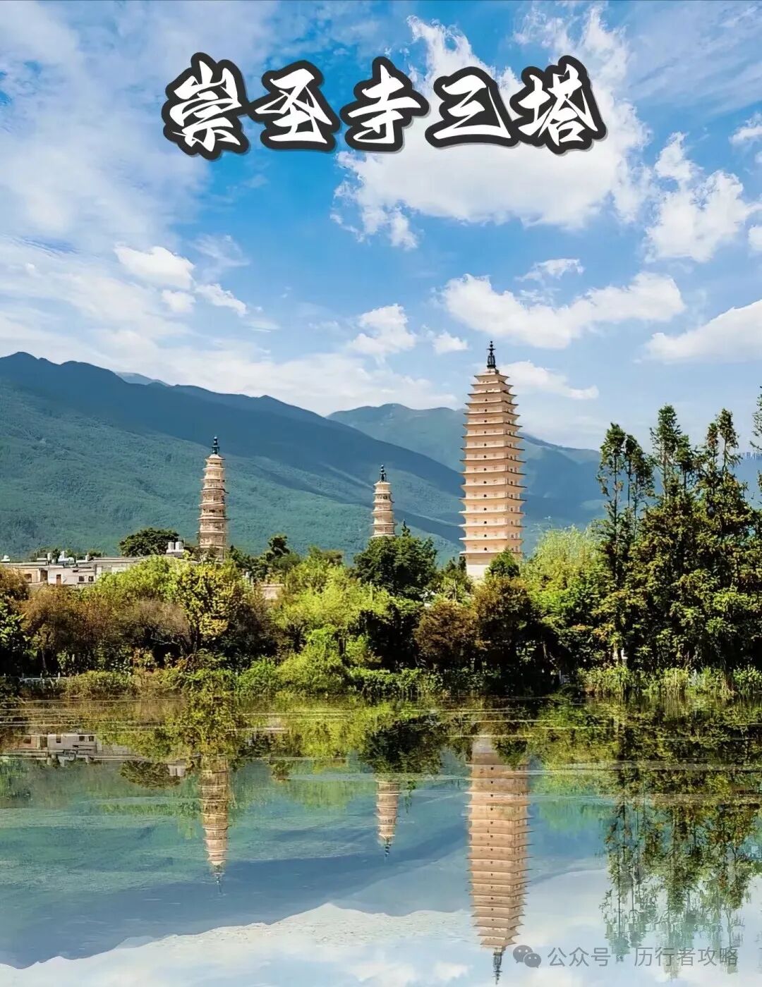 下午:游览崇圣寺三塔文化旅游区,欣赏大理国时期的皇家寺院建筑风格和千年历史。您可以在三塔倒影公园拍摄三塔在水潭里的倒影,感受古建筑的韵味。