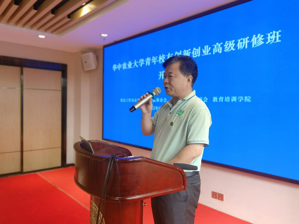 研修班开班式开始,全体学员合唱华中农业大学校歌。杨仁海为学员介绍了我校校友终身学习支持计划包括青创班的缘起与初衷,他说:“学校不仅关心校友们的过去和现在,更关注校友们的未来,希望校友以终身学习计划为平台、纽带、契机,不断提升校友个人和企业核心竞争力,努力成为’勤读力耕,立己达人’的卓越华农人。”杨仁海对此次青创班“四个一”研修模式进行了介绍与解读,希望研修班全体学员能够“感受学校用心之良苦,经受校园潜心之问学,承受百年变局之挑战,享受同辈成长之愉悦!一起用心、用情、用力携手向未来!”