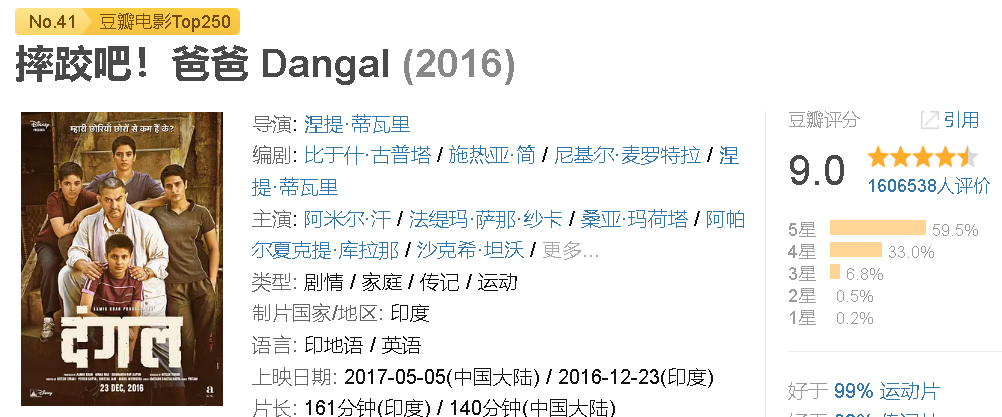 导演: 涅提·蒂瓦里编剧: 比于什·古普塔 / 施热亚·简主演: 阿米尔·汗 / 法缇玛·萨那·纱卡类型: 剧情 / 家庭 / 传记 / 运动制片国家/地区: 印度语言: 印地语 / 英语上映日期: 2017-05-05(中国大陆) / 2016-12-23(印度)片长: 161分钟(印度) / 140分钟(中国大陆)