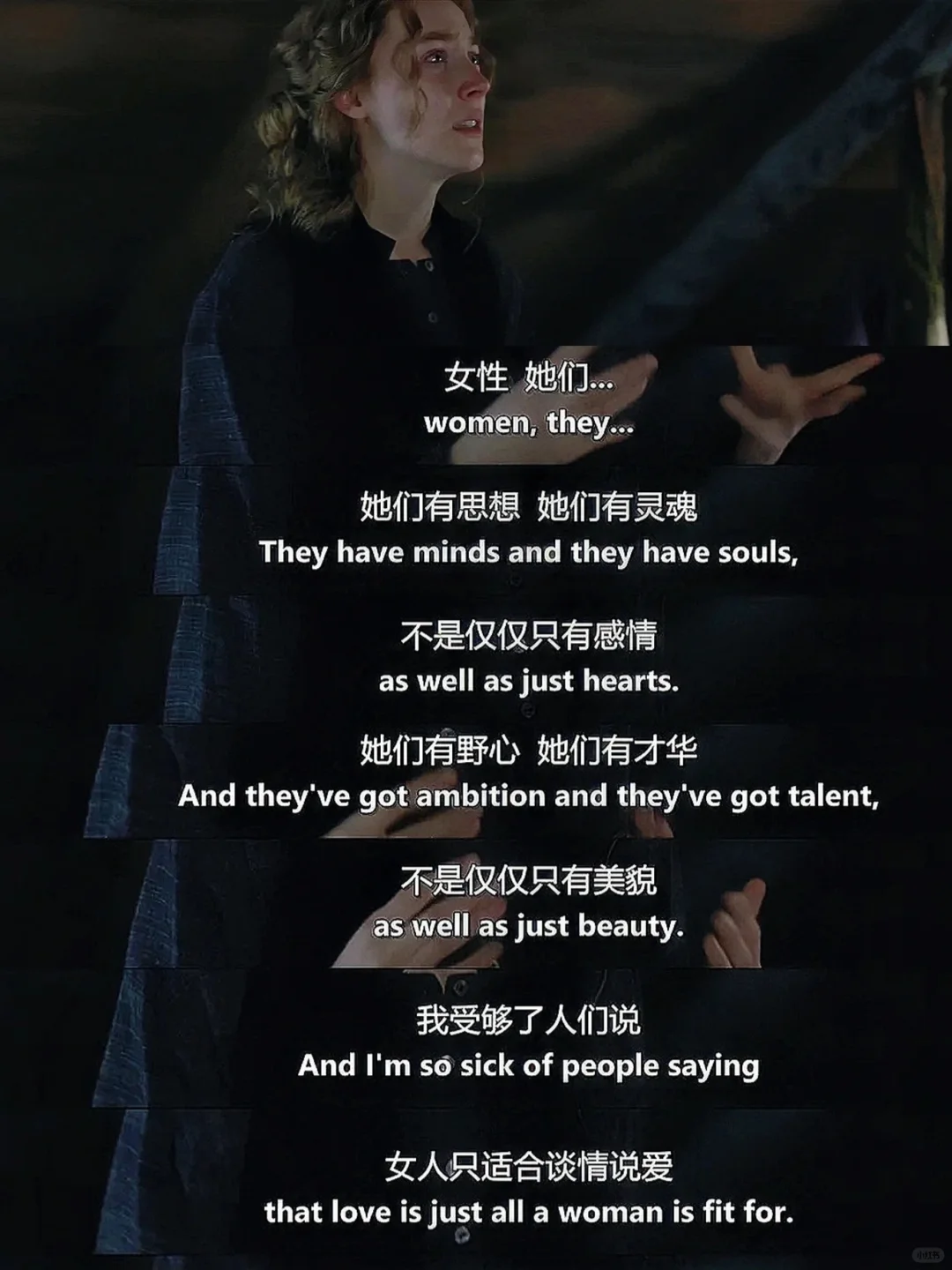 自小就对爱情憧憬的梅格,在要嫁给心爱之人时,面对乔的劝说,毅然决然地回道:“只是因为我的梦想与你们的不同,并不意味着那不重要。”