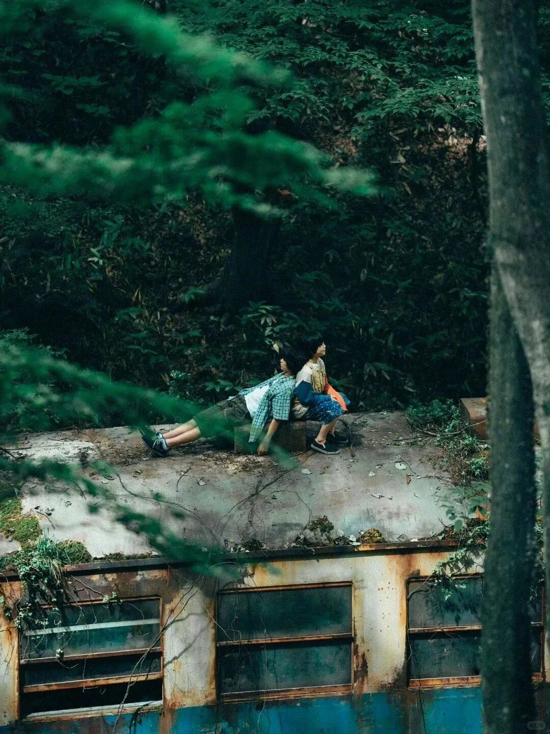 在郁郁葱葱的森林之中,有一个废旧的火车,