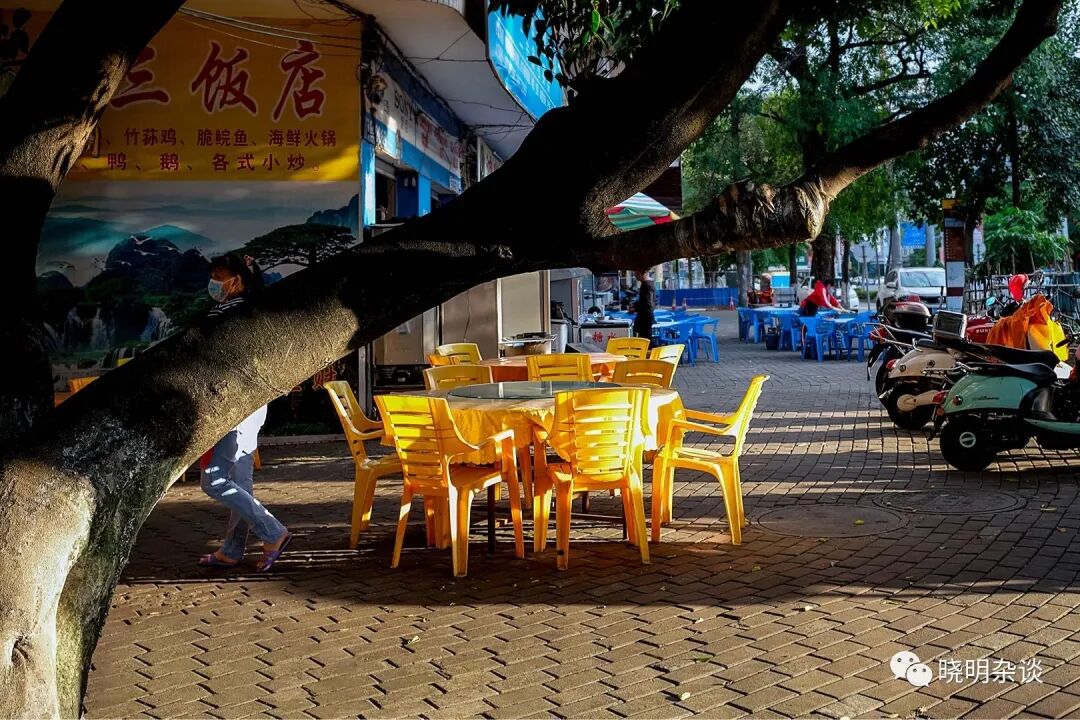 比如图一这张,人行道上,店家摆出桌子准备迎接傍晚后的客人们。景色桌椅都普通,但那几缕照在桌上、地上、树干上的阳光,让整个画面立刻显得不一样了,有了亮点,甚是养眼。
