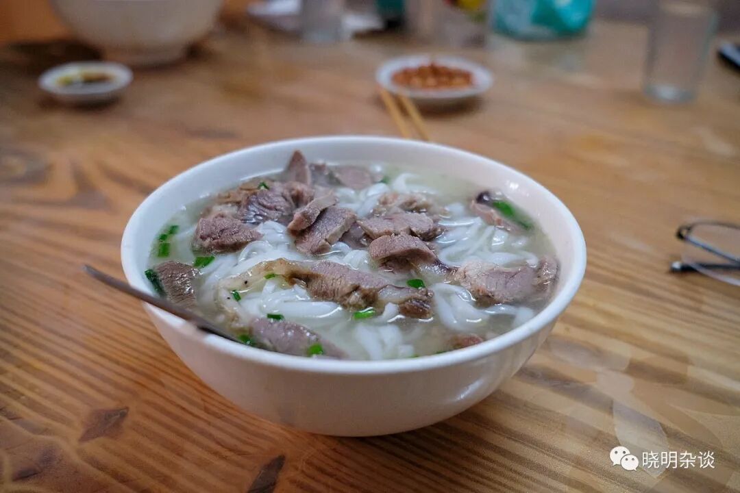 (图15:广西人爱吃米粉。那良粉在防城港一带名气很大,这么一碗10块钱,放了不少肉。与我同桌的两个当地中年人,一人一碗粉,配了一碟花生米,边吃边饮着当地的散酒。)