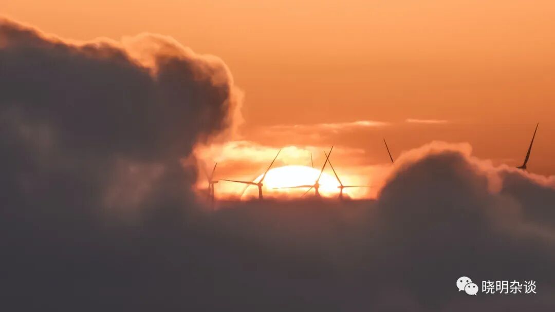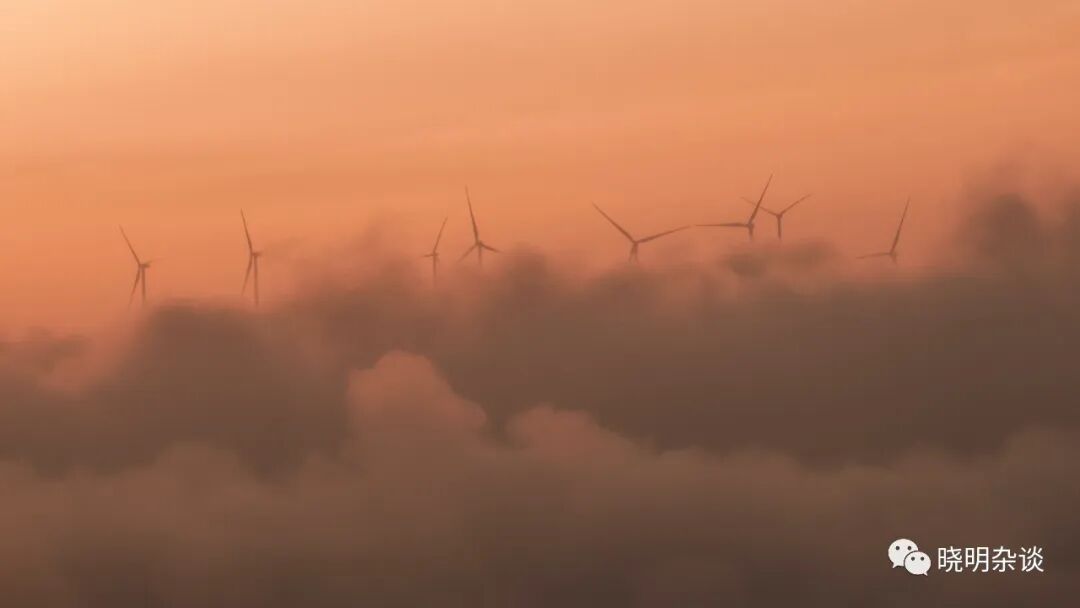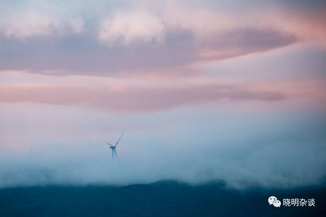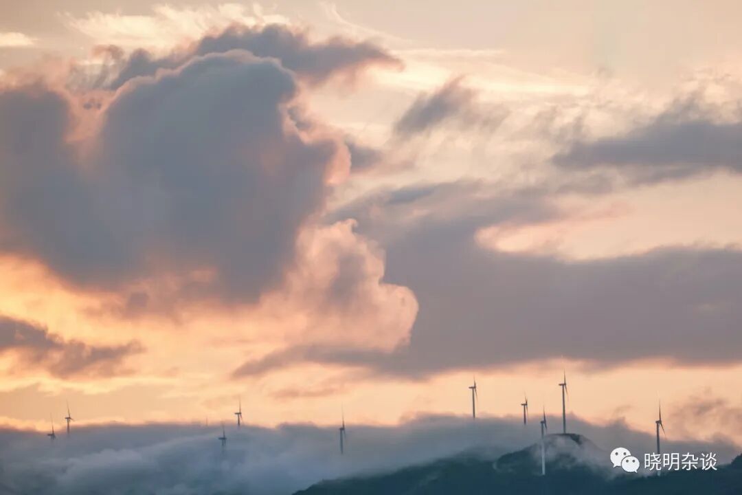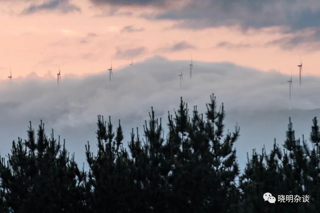(图2: 日出前东边方向,风力发电机像在云海里,也像在雪山里)