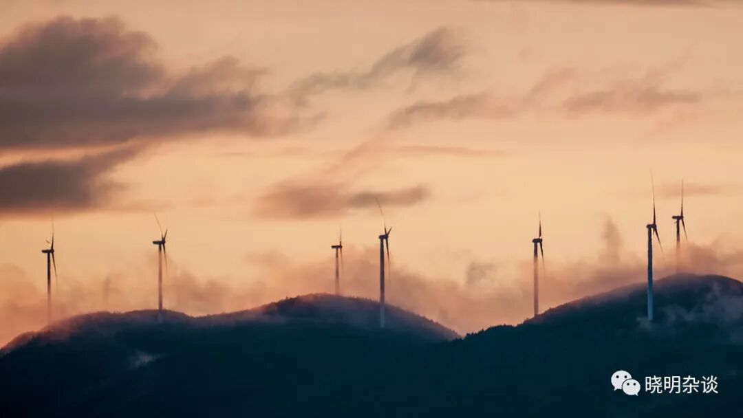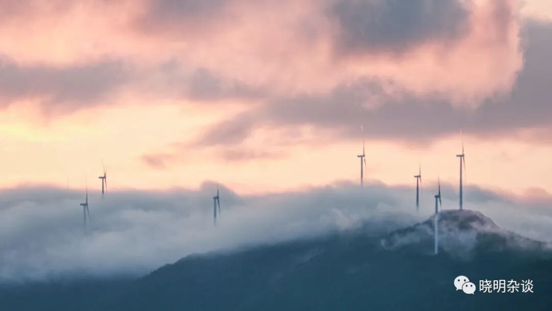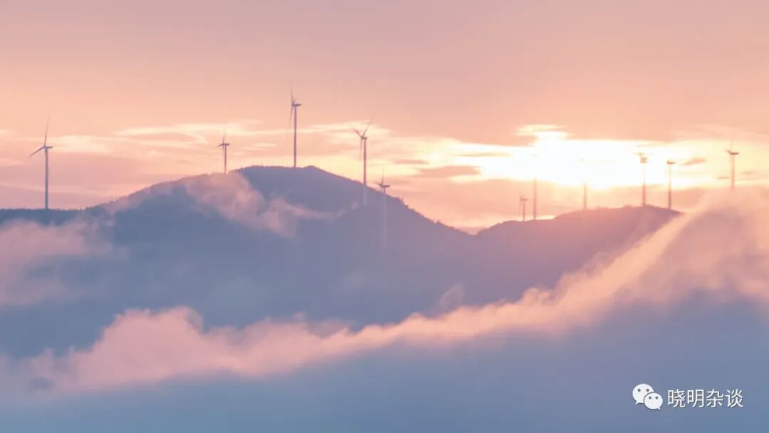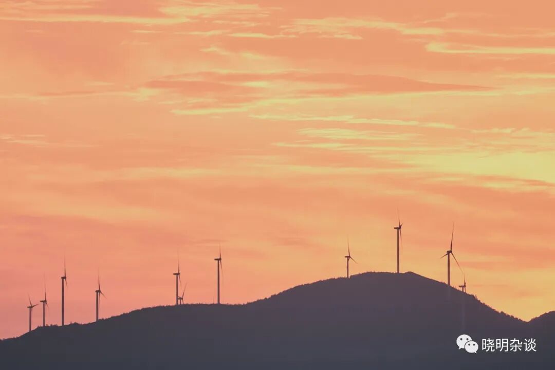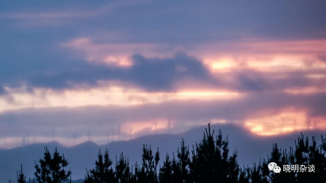 (图2: 日出前东边方向,风力发电机像在云海里,也像在雪山里)