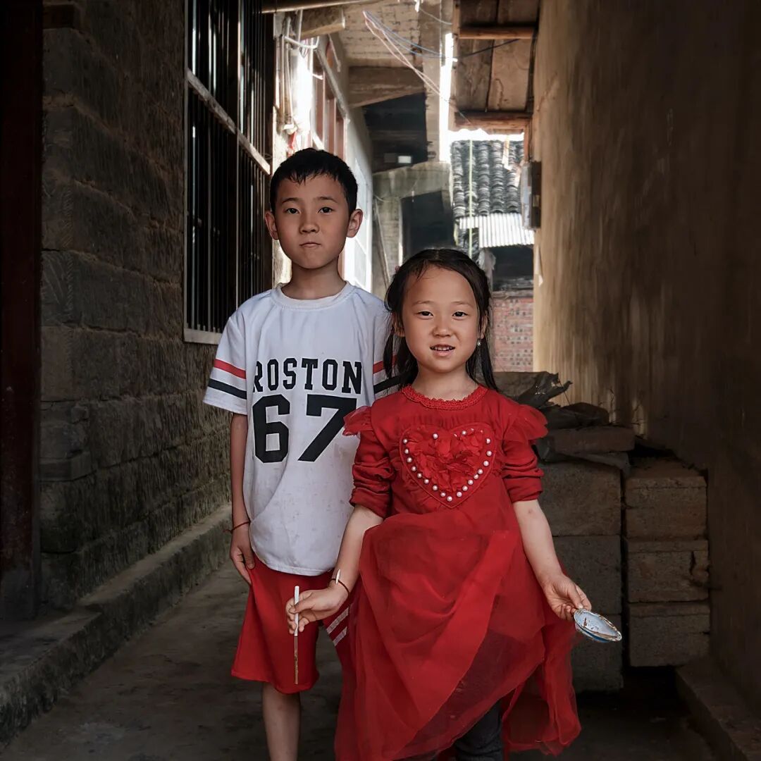 (图4:遇到了在一处走廊玩耍的兄妹俩,小男孩说他今年9岁,就读谋道小学,家人常驻谋道,不过他们的爷爷大部分时间常住老宅这边。)