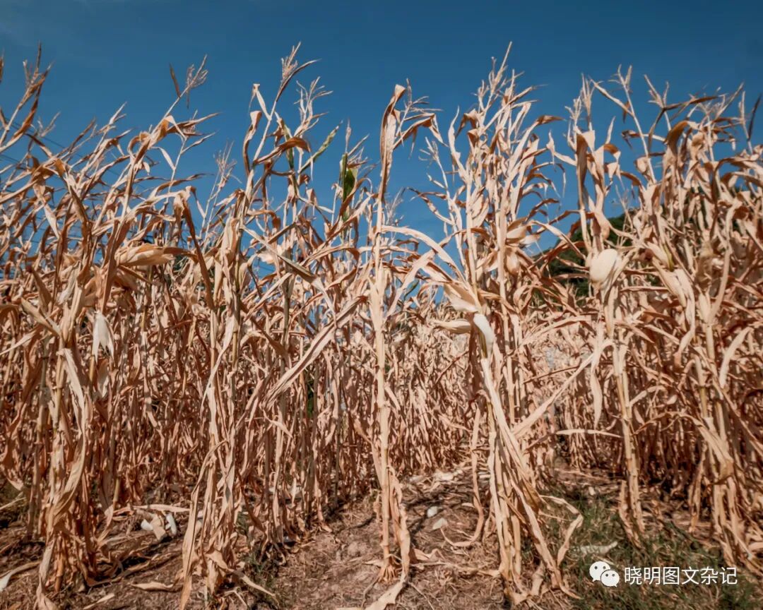 (图4:玉米杆都很细,大部分茎叶都以提前干枯,虽有收成,但减产是必然的。)