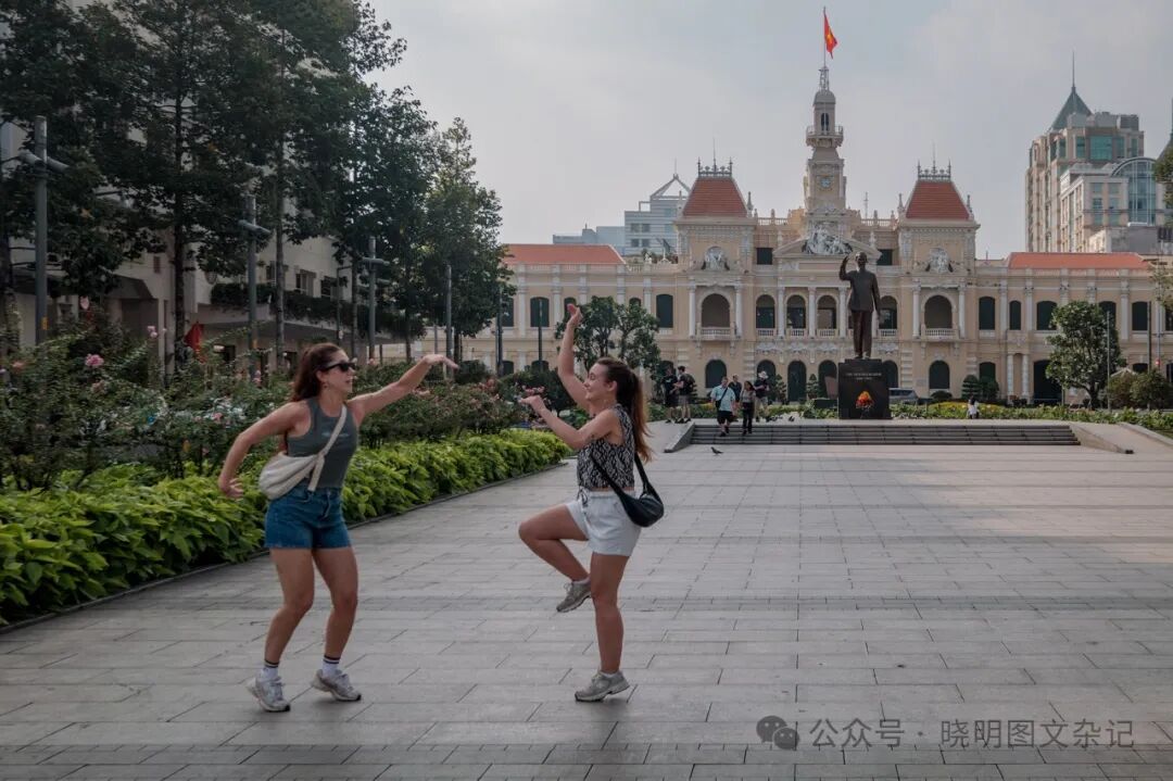 (图8: 市政大楼,门口立着胡志明铜像,两个法国姑娘在摆搞怪姿势拍照。大楼前的广场,夜晚比白天热闹。)