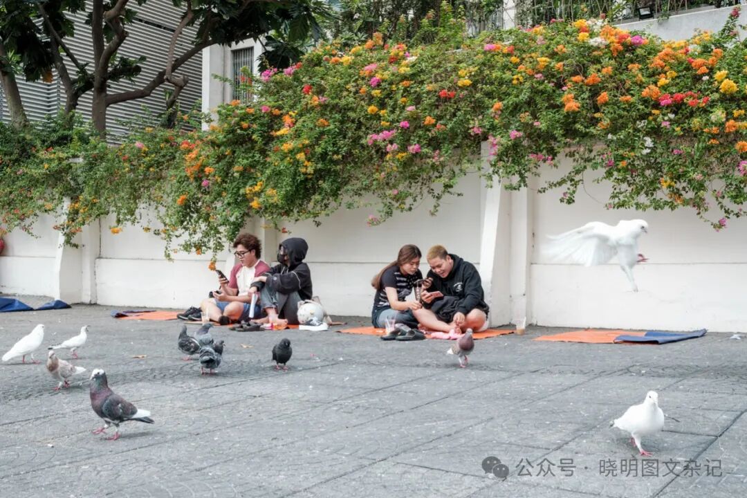 邮政总局对面的人行道上,三角梅盛开,两对韩国年轻人很自在地席地而坐,鸽子们旁若无人。旁边不远,是著名的西贡圣母大教堂,正在维修。