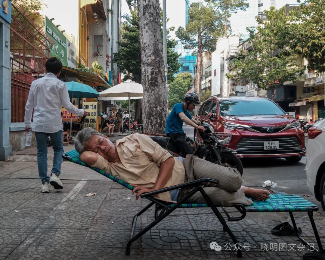 (图23: 繁忙的街道上,老先生睡得很安稳。)