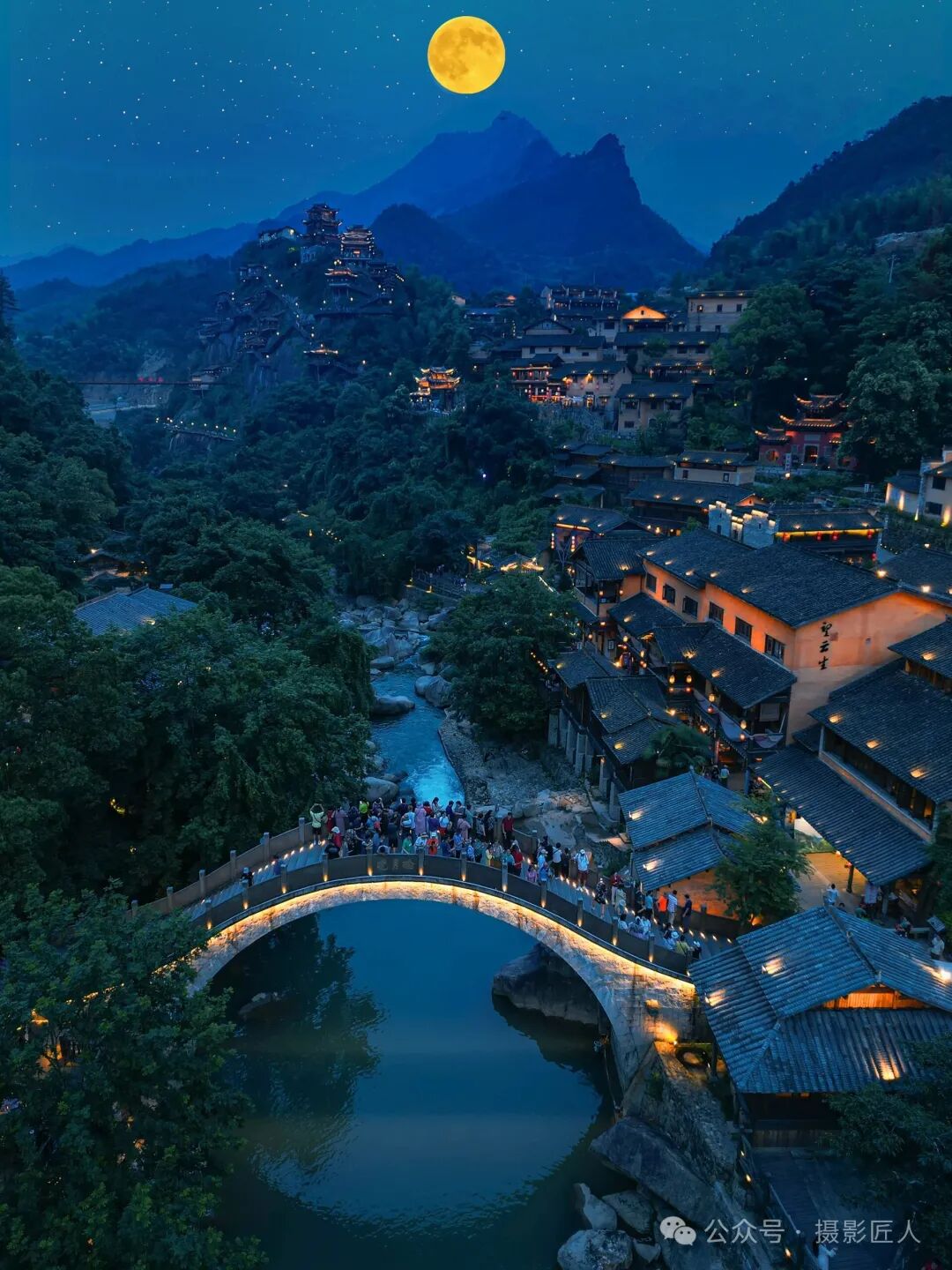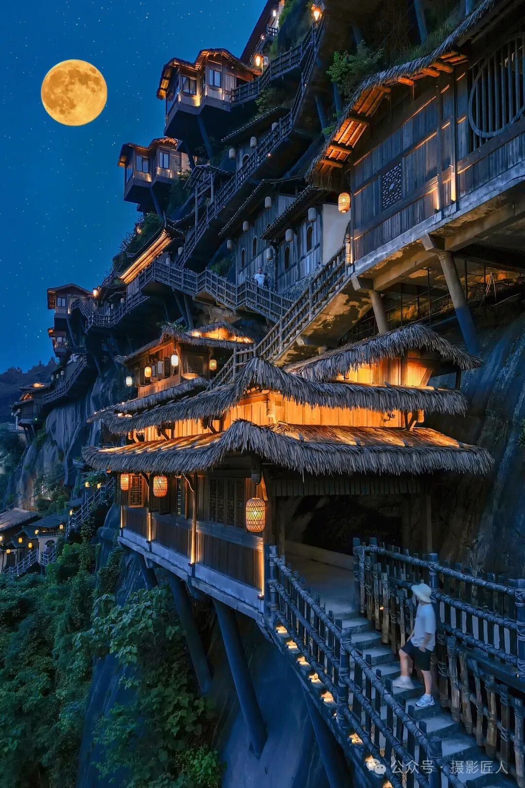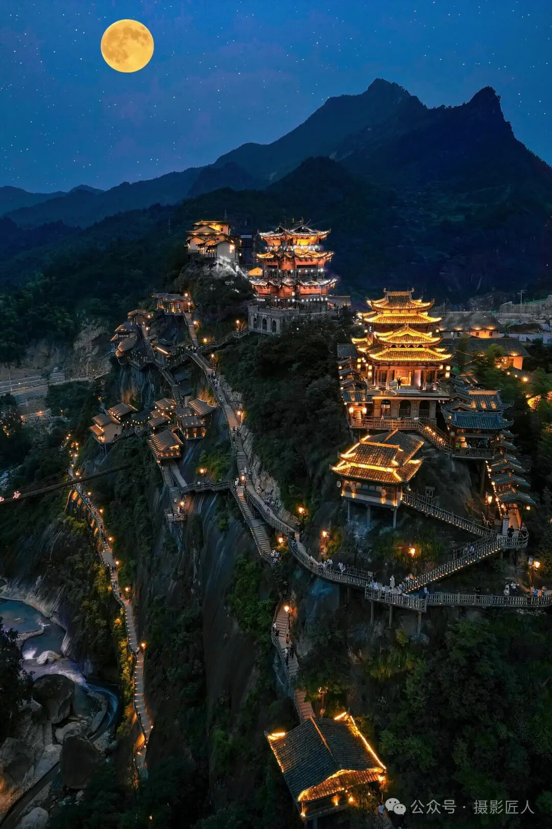 待到夜幕低垂,望仙谷如同仙境般展露真颜,亭台楼阁依悬崖而建,瀑布飞流直下,宛如置身于仙侠游戏世界,美不胜收。