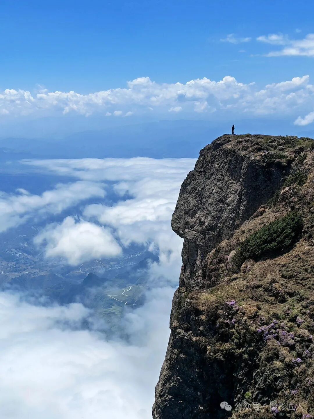 在这撼人心魄的崖畔,一边是如诗如画的清新草原,碧波般荡漾开来,连绵至视线尽头,生命的蓬勃与宁静交织其间;另一边则是瞬息万变的汹涌云海,宛如奔腾不息的白色狂澜,翻滚着扑向无垠的天际,映衬出大自然的恢弘与神秘。