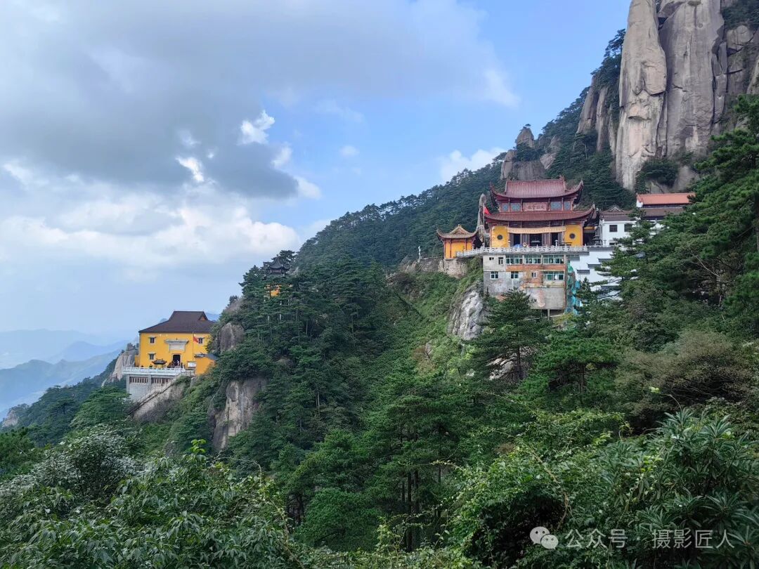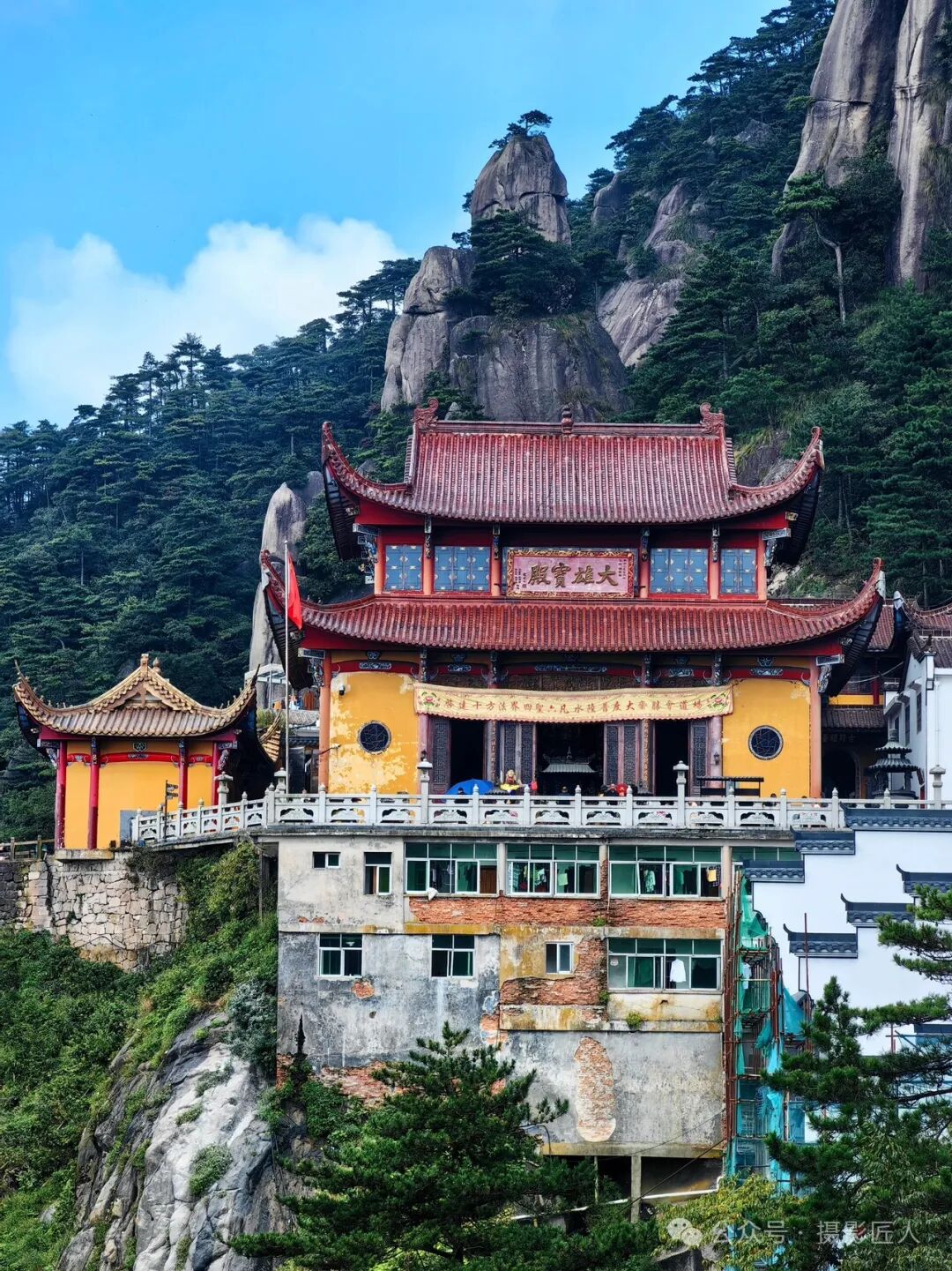 结束了百岁宫的朝拜之旅,驱车前往天台索道站,向九华山主峰天台禅寺进发。有言曰:“不上天台,等于白来九华。”天台禅寺作为九华山海拔最高的寺院,无疑是每一位来访者必到之处。建议采用缆车上下的方式,单程票价85元,往返160元。缆车抵达后,首先映入眼帘的是古拜金台,这是千年之前金地藏长年累月诵经拜佛之处,屋内供奉着金地藏坐像,相较于旁边宏伟的大雄宝殿,古拜金台仅是一间朴素的小瓦屋,却尽显古朴清幽。再拾级而上到达第二站,便是庄重神秘的天台禅寺。如有幸赶上寺中的法事活动,梵音缭绕,置身其间,心灵得以净化,烦忧渐消。