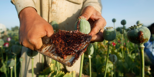 罂粟果实包含乳白色的汁液,农民提取的就是这个汁液,只要在果实上开个口,就会流出这些汁液来,在接触空气之后会被氧化成黑色的胶状物,这个便是最原始鸦片了。