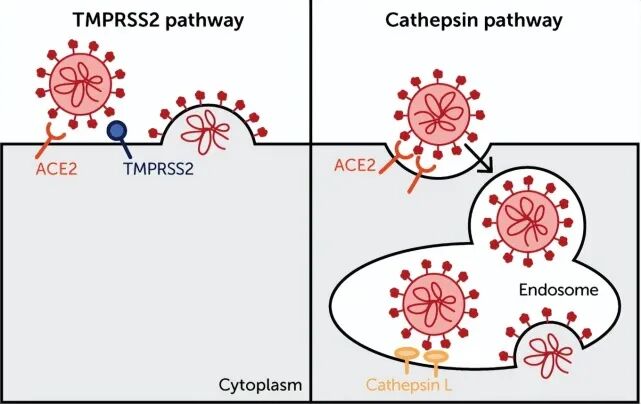 在正常情况下,冠状病毒在接触ACE2受体后,一种名为TMPRSS2的剪刀状蛋白质会剪掉刺突蛋白的一部分,露出允许病毒与人体细胞融合的部分,然后病毒立即将其 RNA 倒入其中以制造新病毒。